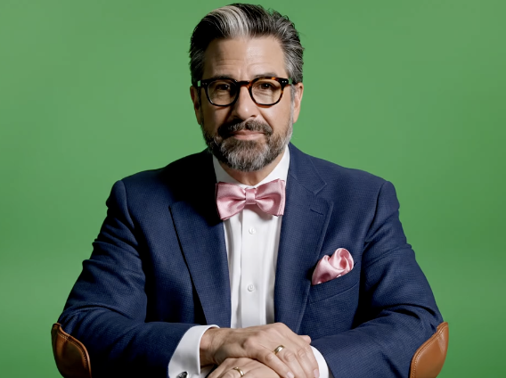 A close-up of the professor on a green screen. The Professor is of average build and a most handsome mid-fifties soft-spoken American academic. His well-groomed hair is thick and dark with a thin streak of salt on top. His temples are also gray accented. He has a short carefully trimmed beard that is mostly dark. He wears tortoise-shell glasses, a pink bow tie, and matching handkerchief and dark blue sports jacket with brown elbow pads over a white shirt and tan pants. He wears a wedding band.