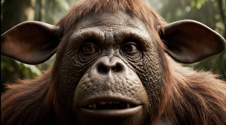 A photorealistic orangutan-cow-faced hybrid with oversized floppy ears stares into the camera and says, “I once thought I saw a human. And it was the ugliest thing I’d ever seen. It stood upright. And it talked.