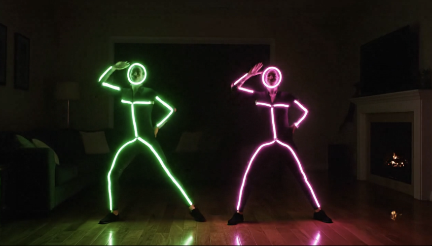 A male and female are dancing in their living room in perfect sync. They have neon tubes taped to ther outfits in the simplest of shapes for stick people (i.e. circle over face, line/spine from chin to crotch, legs and arms extending from spine). The tubes are off. When the lights go out, the tubes glow brightly. it is pitch black except for the neon tubes. The female lights up hot pink, the male, lime green. Both are perfect replicas of stick people who continue dancing in sync. No living room or reflections are desired. Just pink and lime stick people dancing against black background.