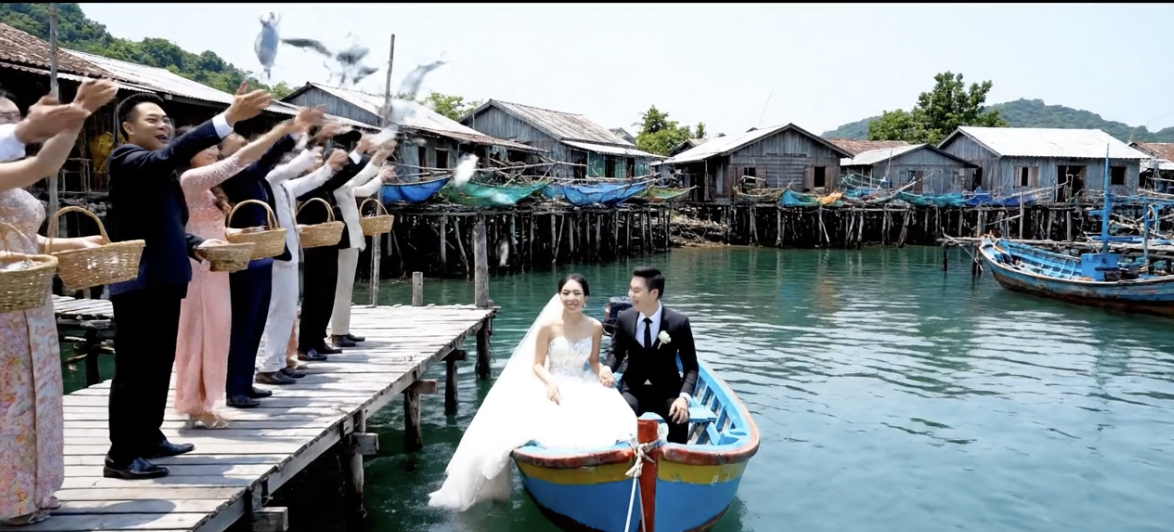 A newlywed couple (bride still in wedding gown) board a small boat in an Asian fishing village. The gussied up guests simultaneously toss small fish at the bride and groom while seeming to congratulate the couple