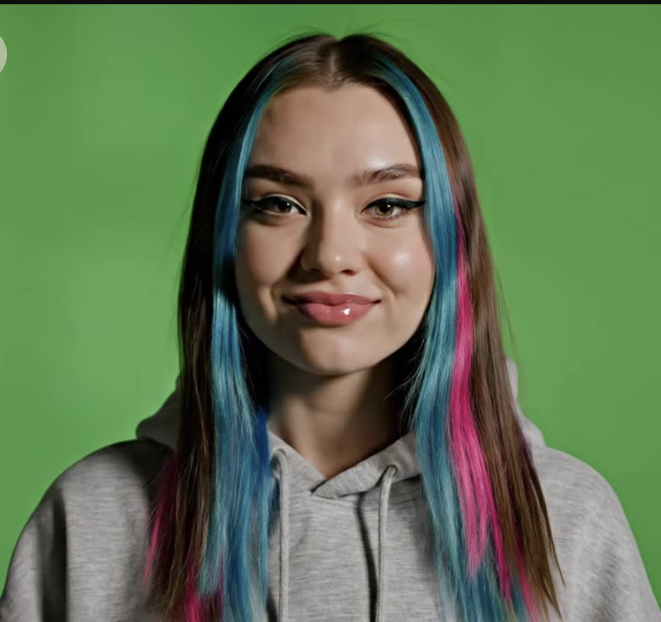 A static close-up of an attractive slightly smiling gen-z er on a green screen under natural lighting. She has unusual hair colorings.