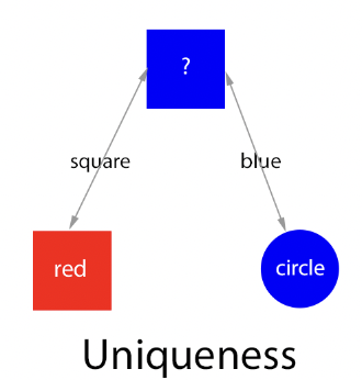 Since the red square is unique by color and the blue circle is unique by shape, the blue square is the only object that is not unique, which makes it the most logical choice for the one that doesn’t belong.
